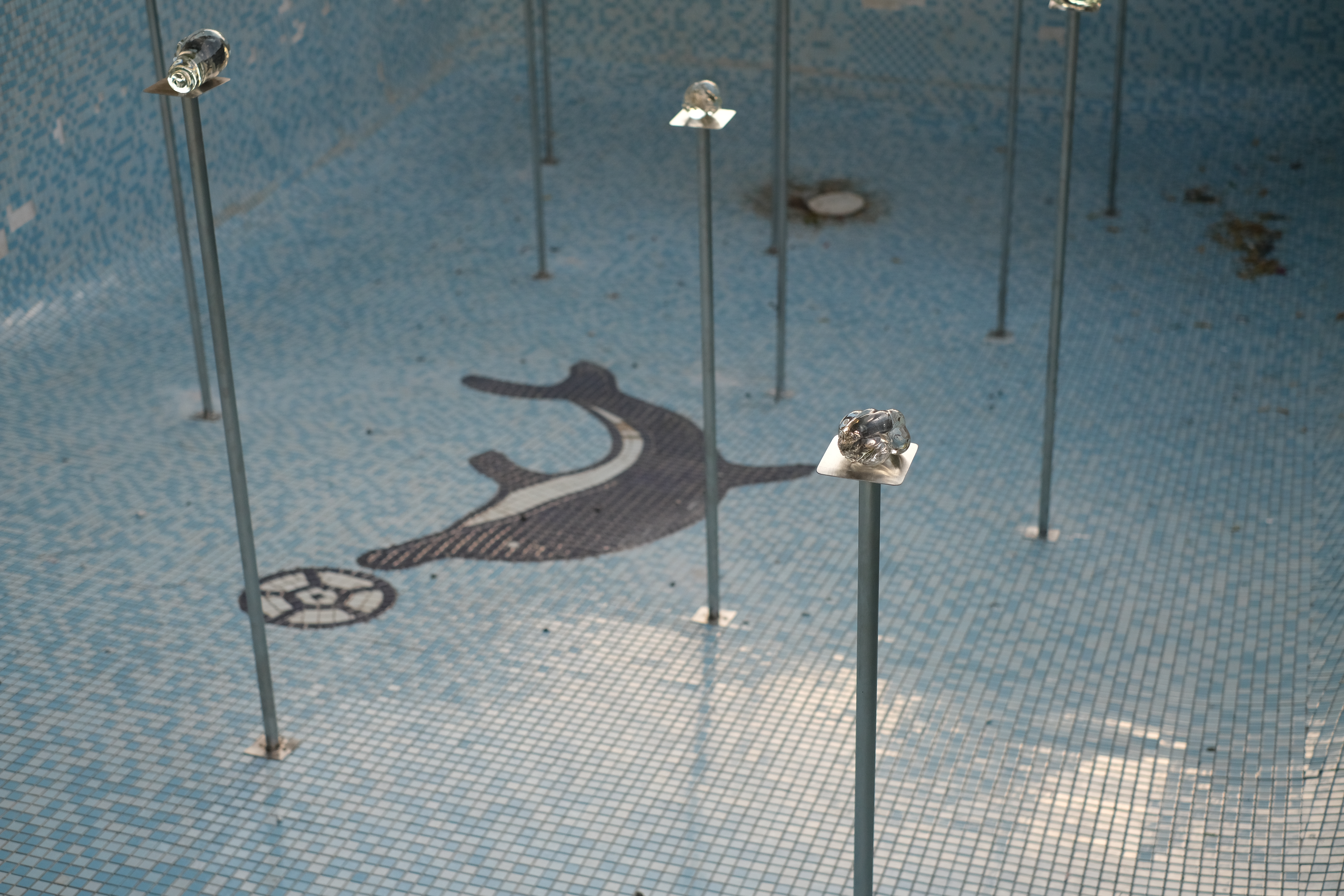 40 Frankincense infused glass sculptures, 2 Channel Video, Sound